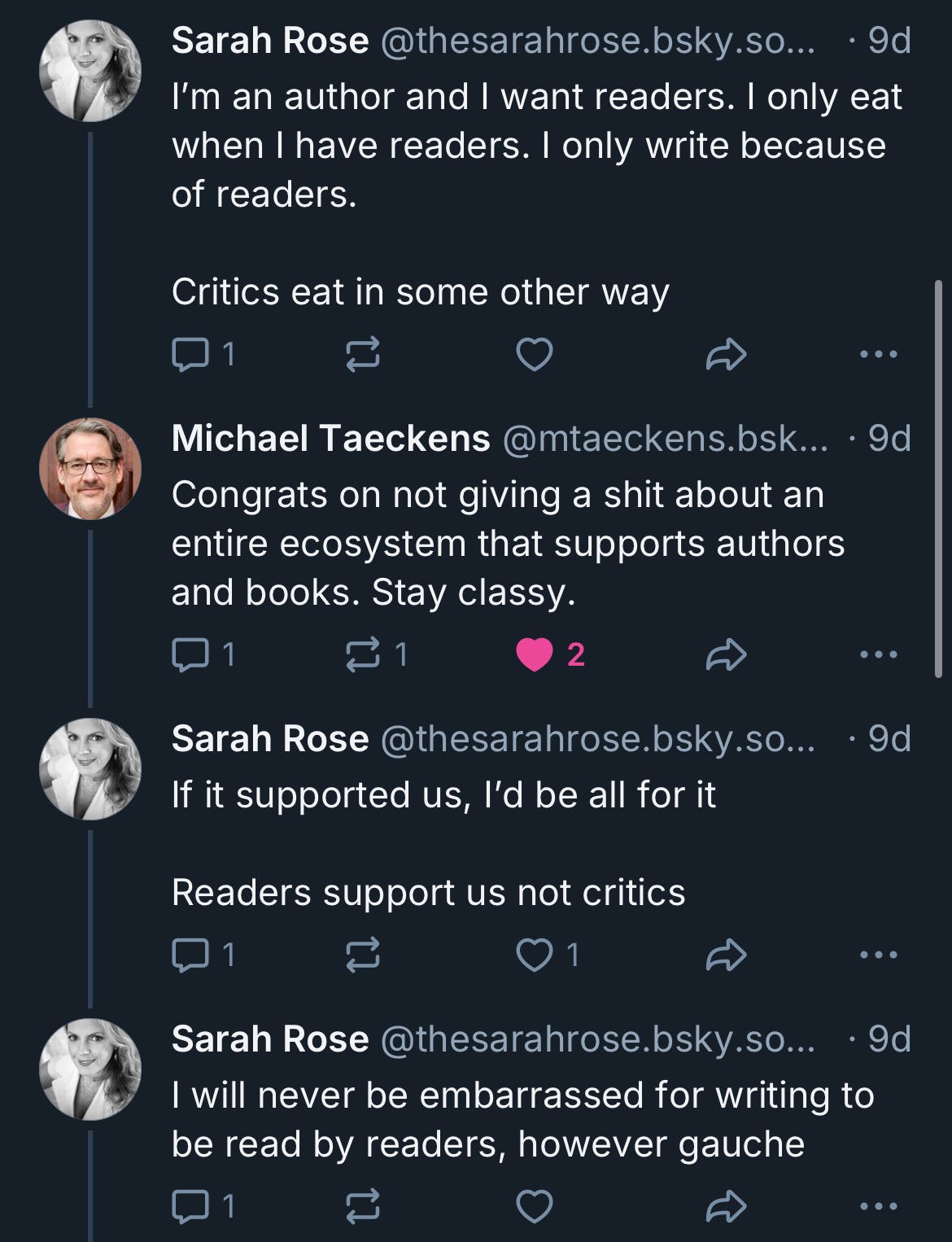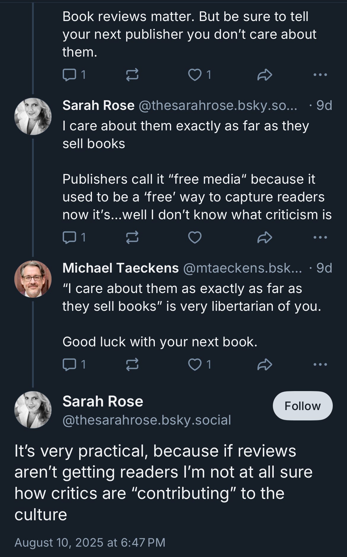 But back to books, since I make my living primarily as a freelance book critic. When the AP news made the rounds on Bluesky on August 10, my freelance book critic group chat commiserated over the news, and in particular over one author’s profoundly bad take on it. In response to a thread by journalist Mark Harris, who pointed out that “People complain about critics as gatekeepers; wait until all that's left is marketing,” this author claimed that “The trouble is it’s already all just marketing[.] A book does well when there are marketing dollars behind it not when there are good reviews behind it and we’ve been in this place for a while[.]”
